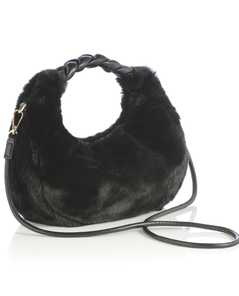 * L 11" × W 3.5" × H 8"; Hnd 5"; Adj 42" * PU And Faux Fur * Gold Hardware * Single Handle; Detachable Cross-Body Strap * Top Zip Closure * 1 Inner Zip Pocket; 1 Inner Slip Pocket *