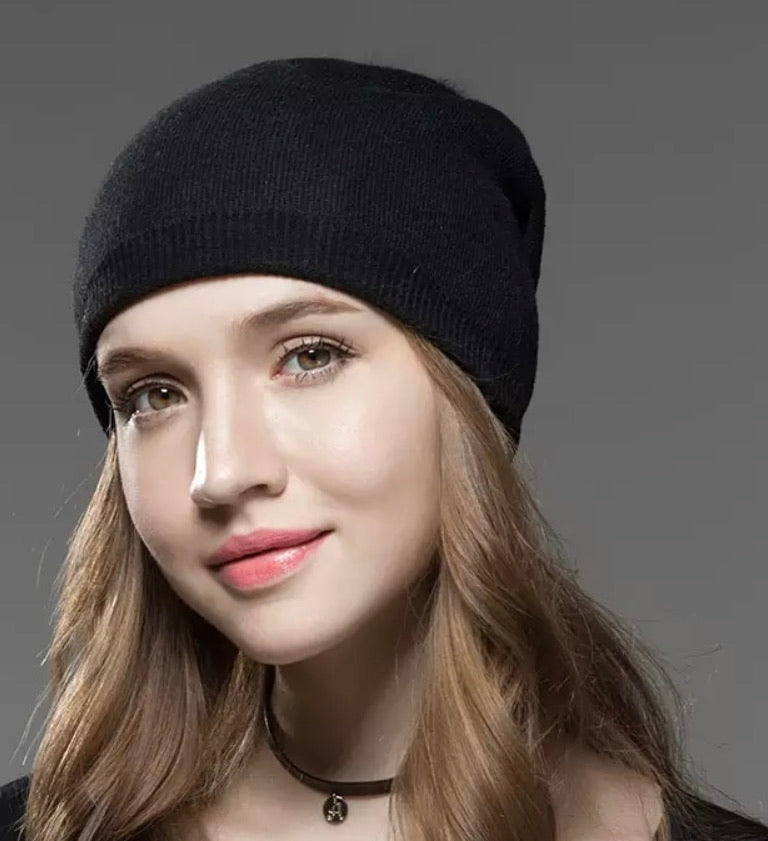 Cashmere hat with real fur pom. Fits beautifully with the perfect slouch. Pom is removable