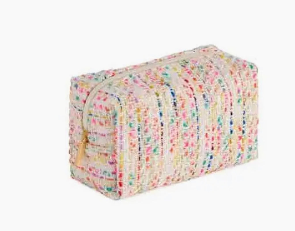 Measures L 7" x W 3" x H 4"Made from cotton, polyester, and nylon, your new must-have for stylish storage on the go. Crafted with a colorful, textured boucle fabric, this petite pouch adds a playful pop to your everyday routine. Its boxy silhouette and secure top-zip closure keep your beauty essentials or tiny treasures safely tucked inside. Whether it's tossed in your tote or perched on your vanity, this pouch makes organizing feel like a treat.